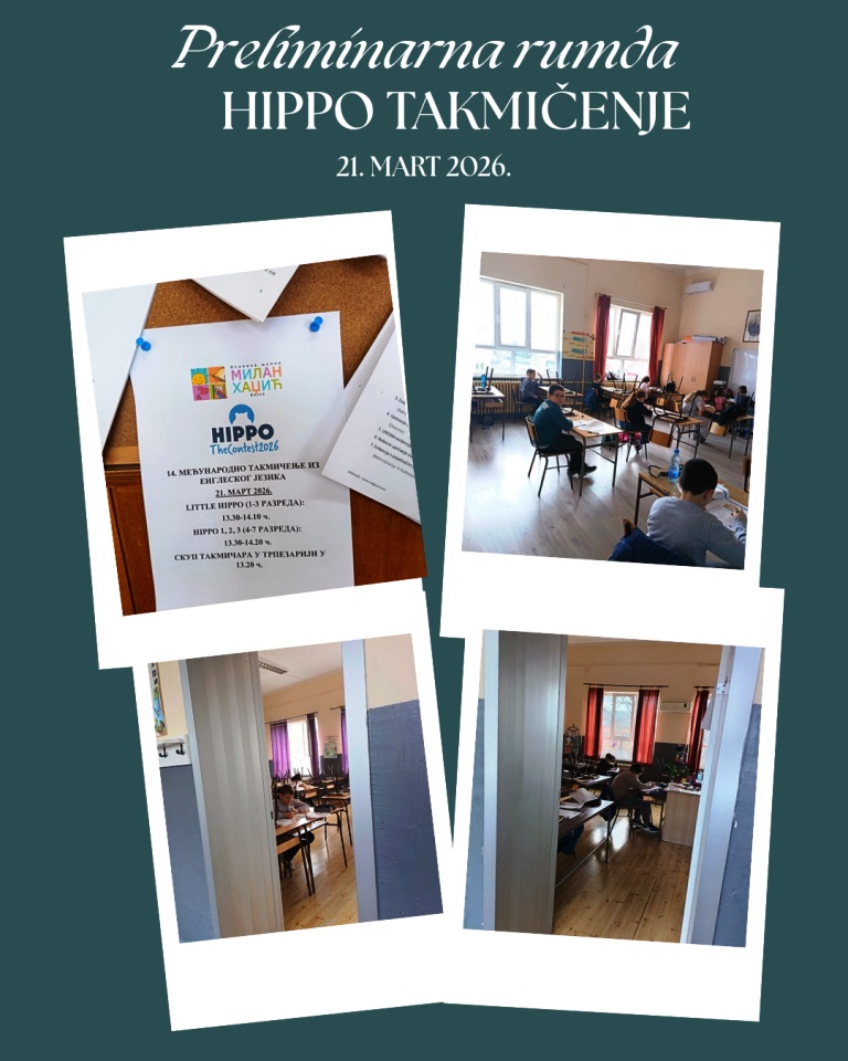 Наша школа је ове године по први пут учествовала у међународном такмичењу у познавању енглеског језика под називом HIPPO. Прелиминарна рунда се одржала у нашој школи у суботу, 21. марта 2026. године. Учешће су узели ученици 2-7 разреда и то њих 31. Ученици другог и трећег разреда такмичили су се у категорији LITTLE HIPPO, четвртог и петoг HIPPO 1, шестог HIPPO 2, а седмог HIPPO 3. Тестиране су вештине читања и употребе језика. Ученици су вредно решавали тестове и задаци им се нису учинили претешким. Ми сада ишчекујемо резултате и надамо се да ће се велики број наших ученика квалификовати за национално финале које је планирано да се одржи крајем априла.
